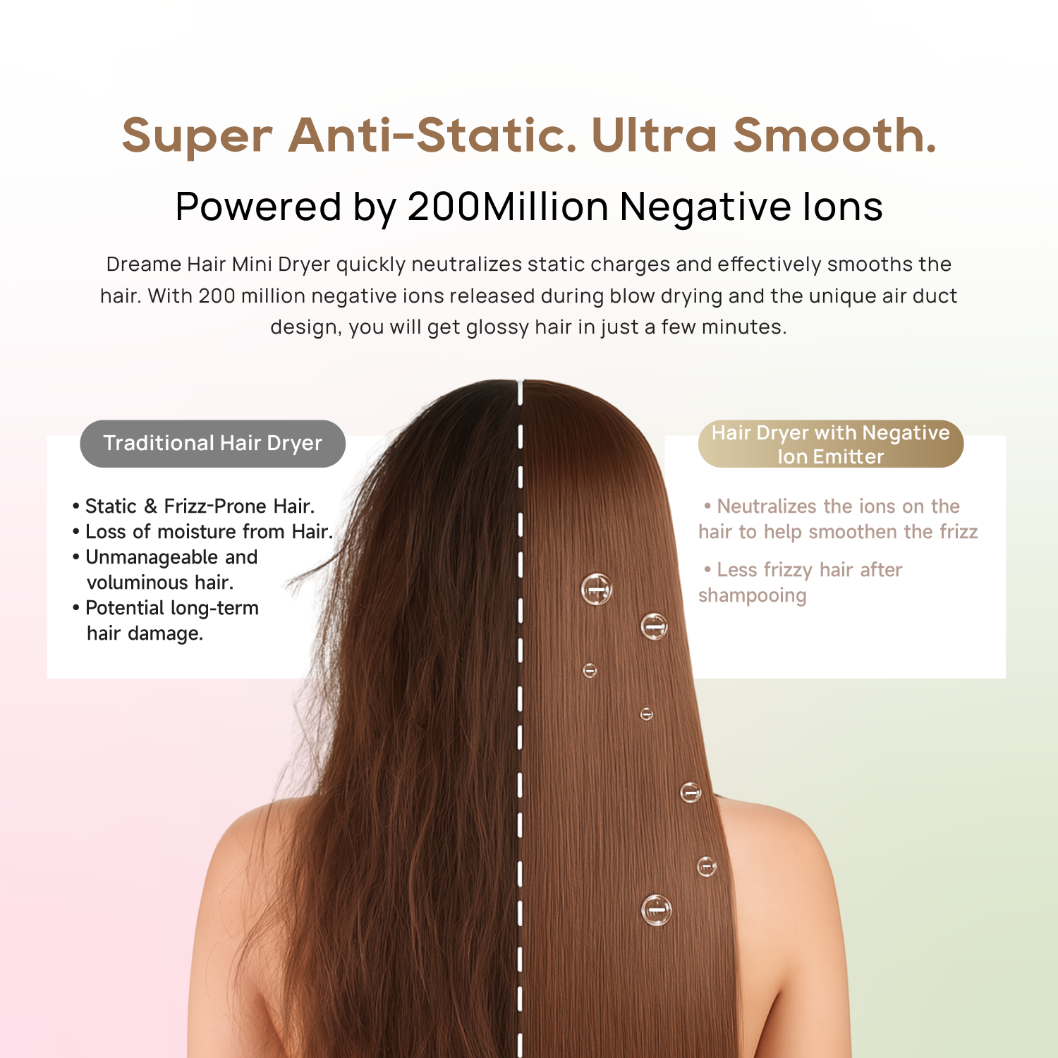 Dreame Hair Mini High-Speed Hair Dryer quickly neutralizes static charges and effectively smooths the hair. With 200 million negative ions* releasedduring blow drying and the unique air duct design, you will get glossy hair injust a few minutes.