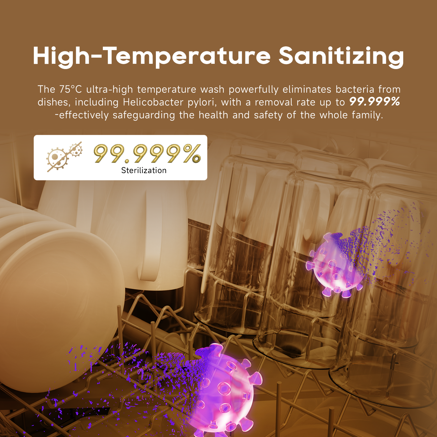 The 75°C ultra-high-temperature wash powerfully eliminates bacteria from dishes, including Helicobacter pylori, with a removal rate of up to 99.99999% —effectively safeguarding the health and safety of the whole family.