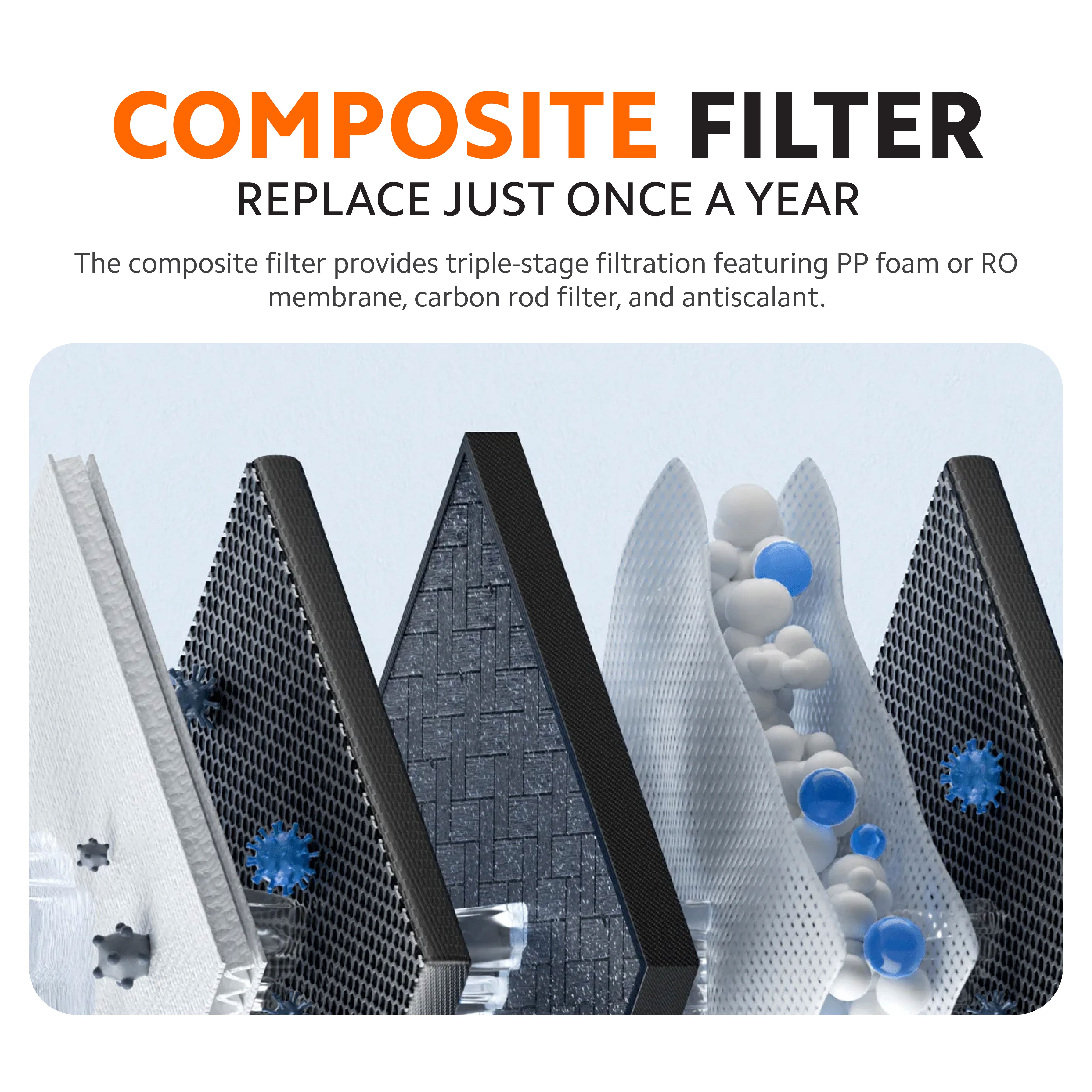💧【Triple-Stage Filtration System】Includes PP foam, activated carbon rod, and antiscalant for effective initial water purification.